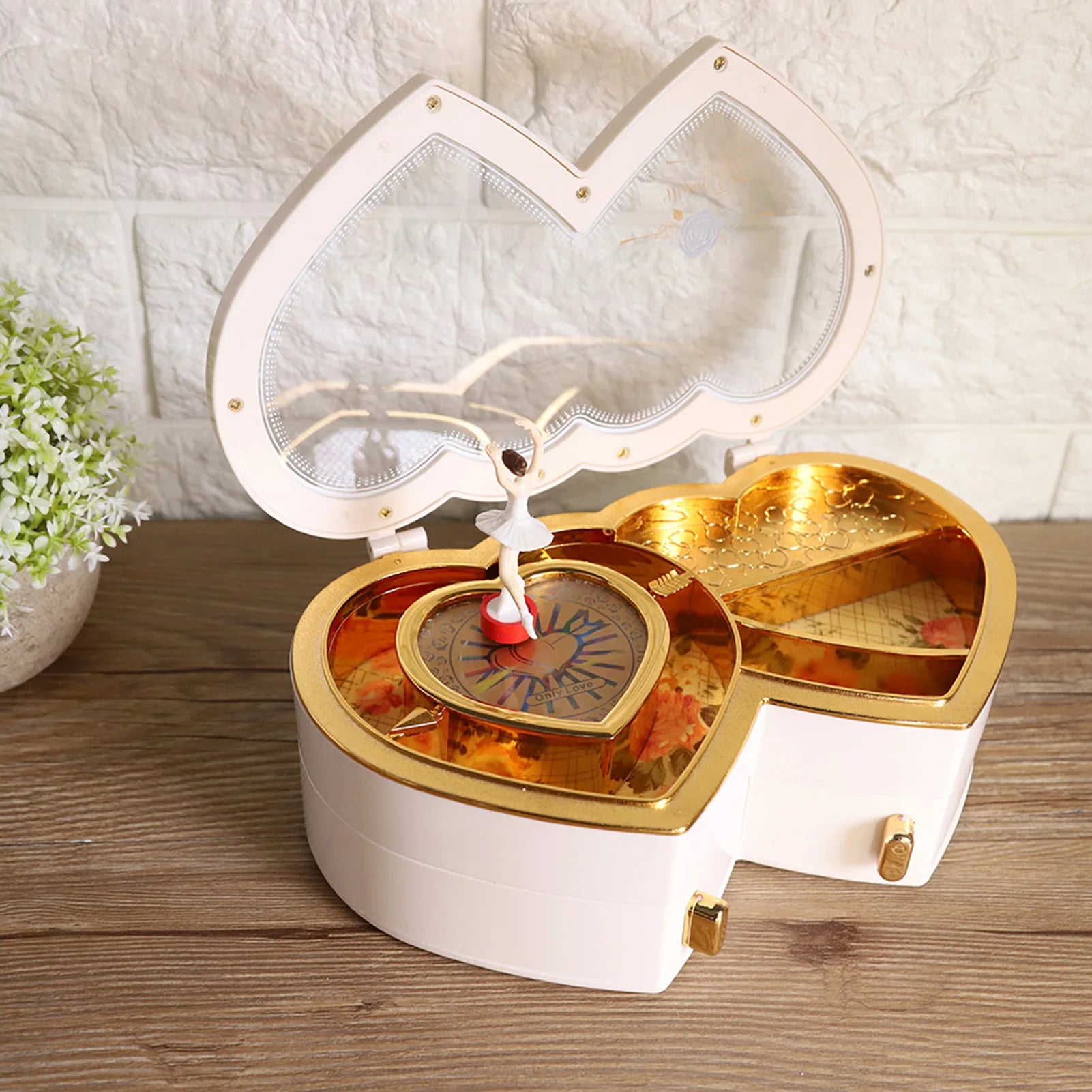 Ballet Dancer Music Box Double Heart Shaped Jewelry Storage Case Ballerina Musical Box Gift For Girls