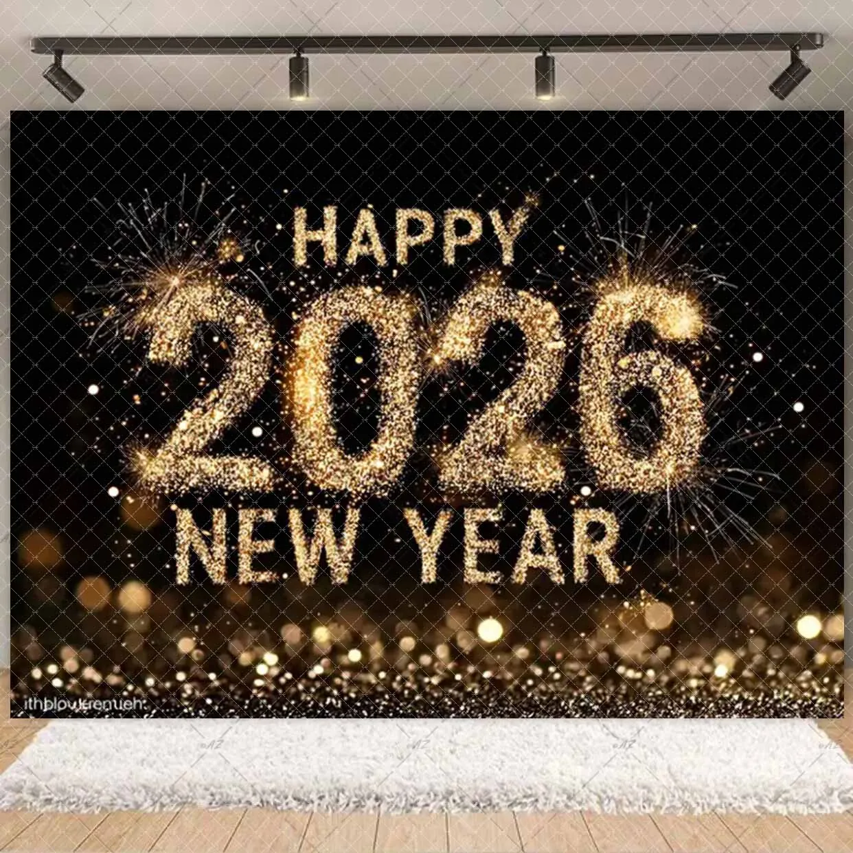 2026 Happy New Year Eve Party Decorations Black And Gold Disposable Tableware 2026 Number Balloons Family Gathering Backdrop