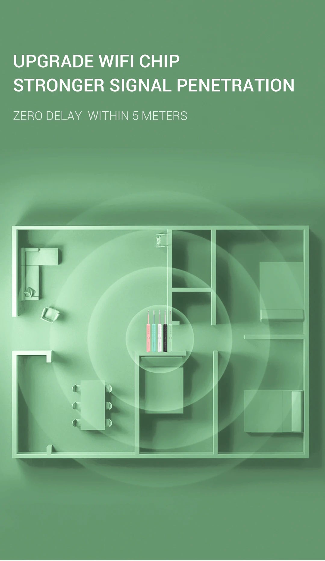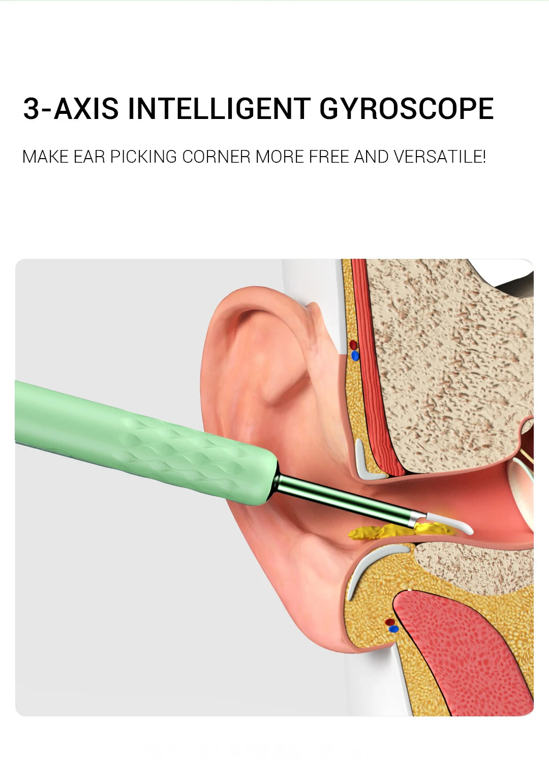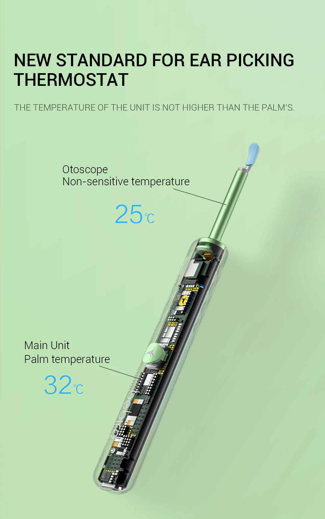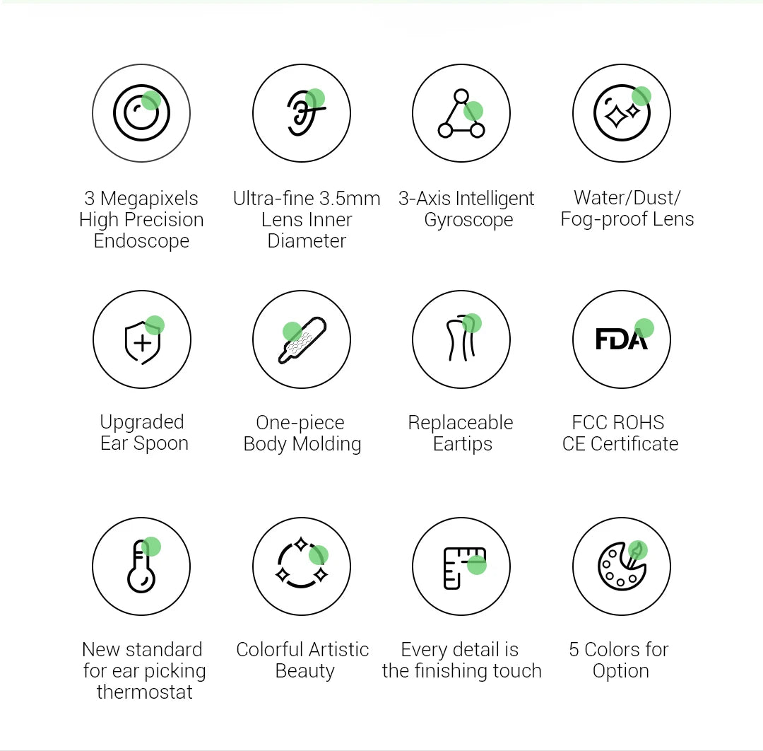 Rapid WiFi visual connection. No connection is required to open picking ears. Use optical lens and high performance 300W pixel. The CMOS sensor has a clear picture, 20X amplifying ear canal & 100° viewing angle. 13 lens combination & 6 LED lights. IP67 waterproof lens. Water washable. Adapt to dry ear, oil ear and other complex environment. 3 axis smart directional gyroscope quick positioning, screen is not bias & shake. High-end OV chip video coding technique, hand-eye synchronous exciting picking! Strong WiFi signal, penetrating power, avoid delay. More safety protection. Earpick head buckle, over-hot earpick protection, timing automatic shutdown, children lock and anti frost cracking protection. Smart constant temperature control. Prevent low temperature & ear burning . Otoscope: 25°C non-inductive temperature. Earpick body: 32°C palm's temperature. Long endurance. Built-in 185mAh large capacity battery. Picking once a week for 10 minutes, can use about 30 days.