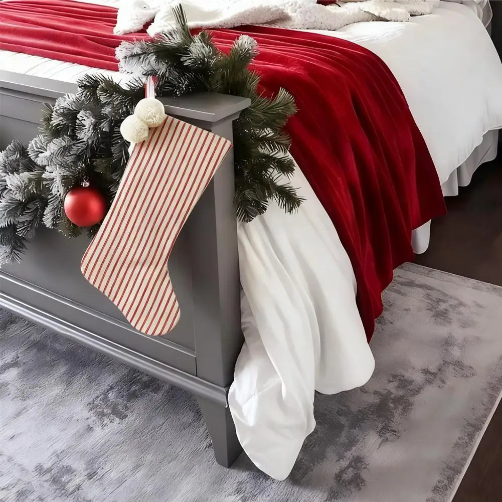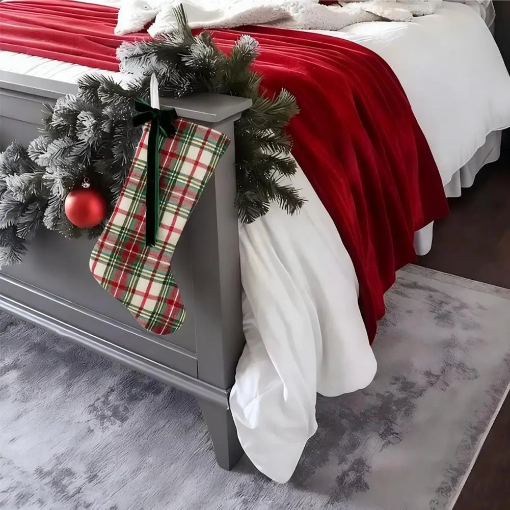 1. Crafted from premium cotton and soft polyester, these Christmas stockings feature a refreshing red and green plaid stripe pattern with a bow-tie plush pom-pom. Fresh, rustic yet elegant, they add a touch of warmth to your holiday decor.