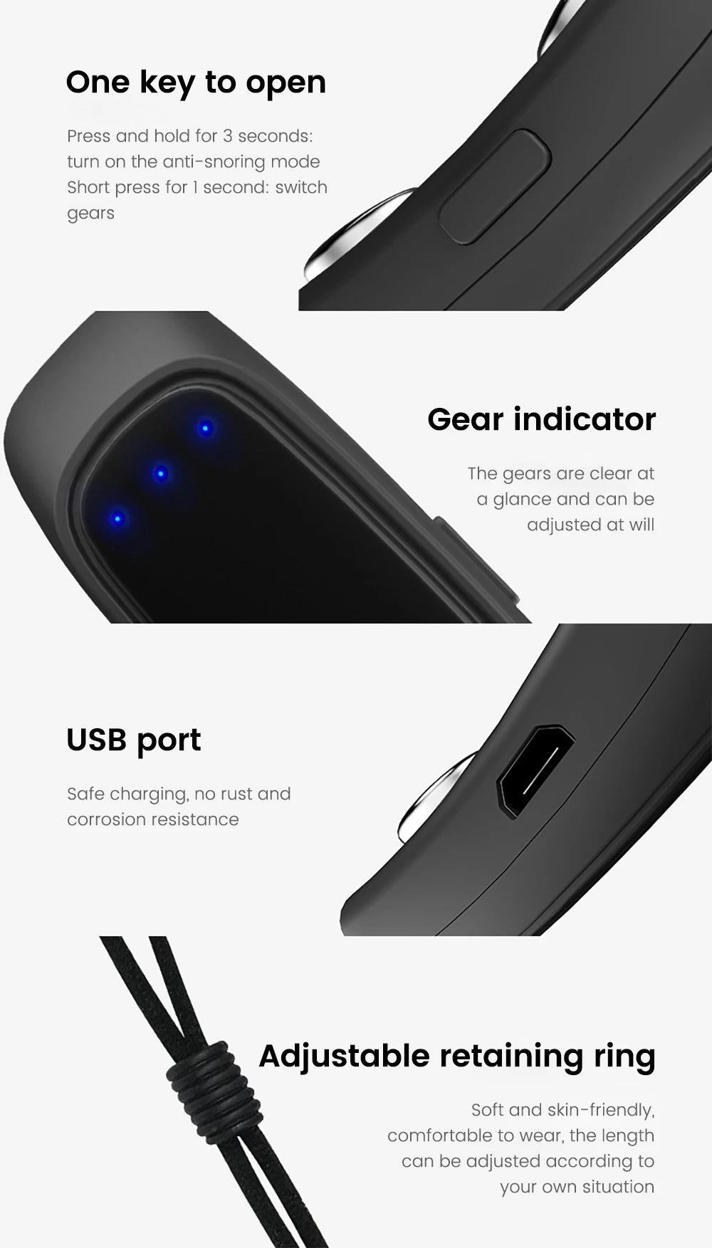 The product automatically and accurately detects snoring through high-precision sensors, massages the hypoglossal nerve and jaw muscles with different frequency vibration pulses to tighten the muscles, adjust the breathing rhythm. and make the breathing more smooth