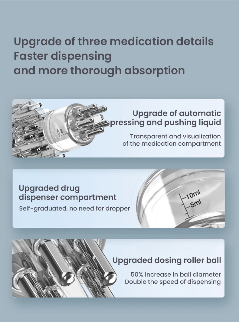 5. Ultrasonic vibration technology6. No operation 10 minutes automatic shutdown7.Self-medication box